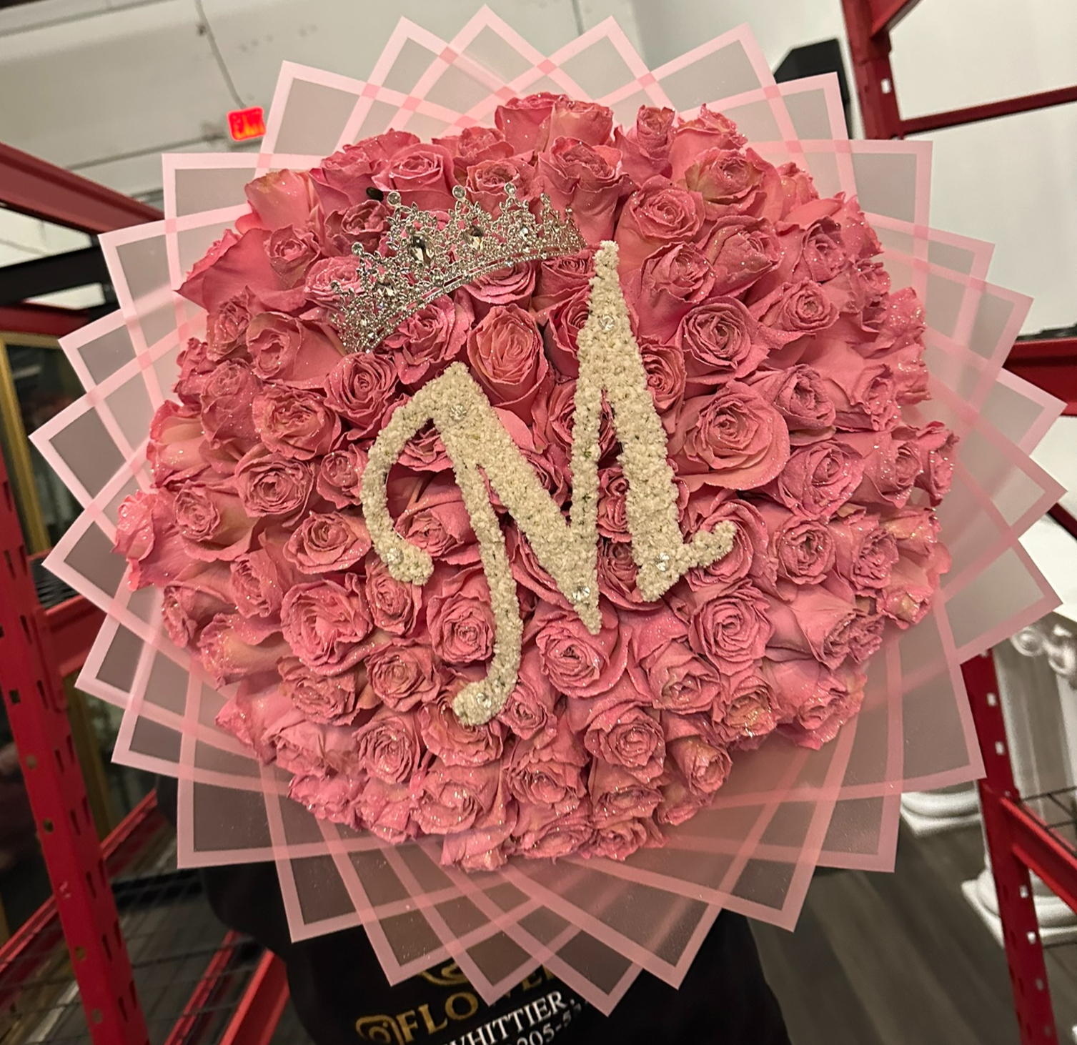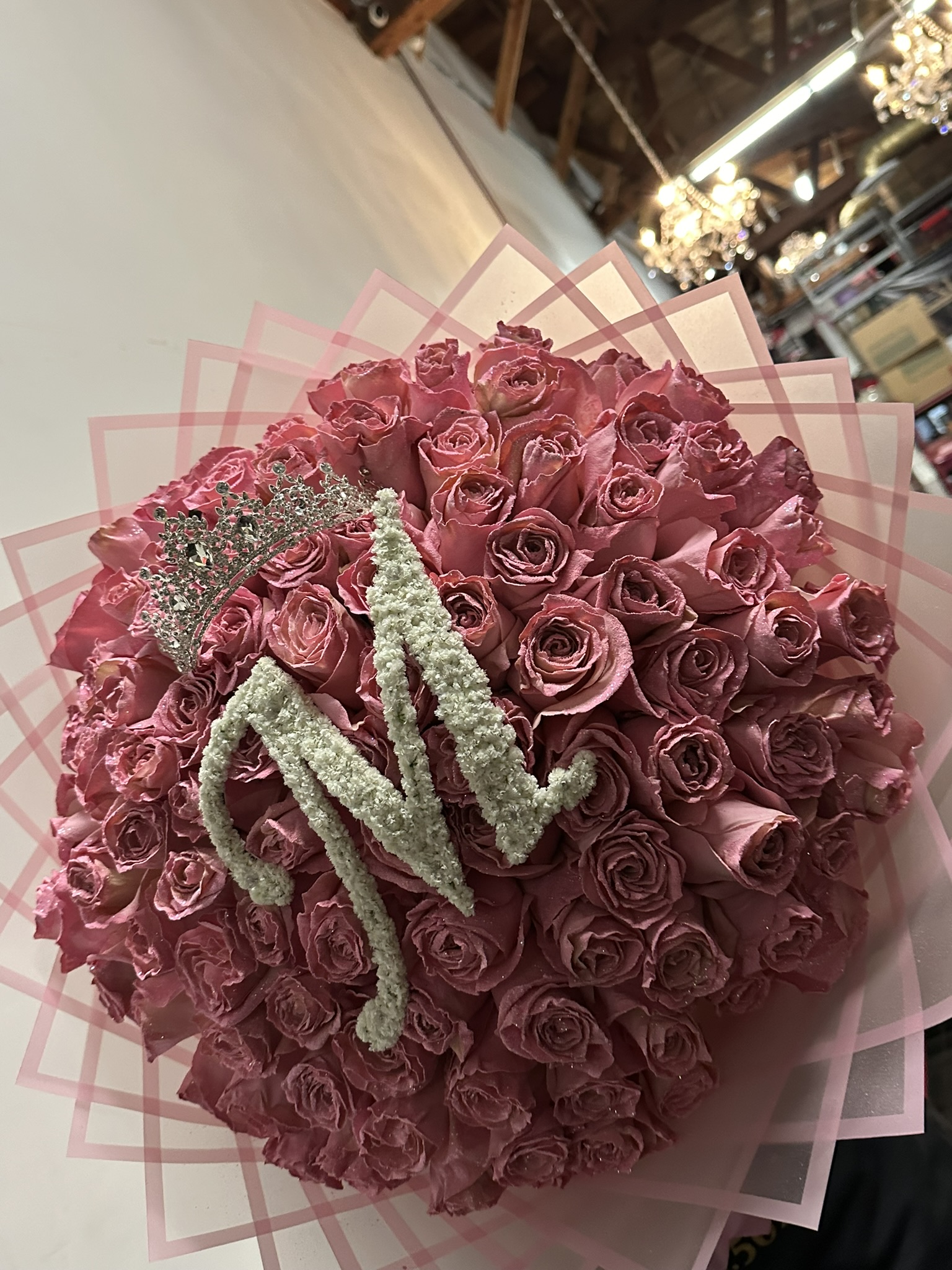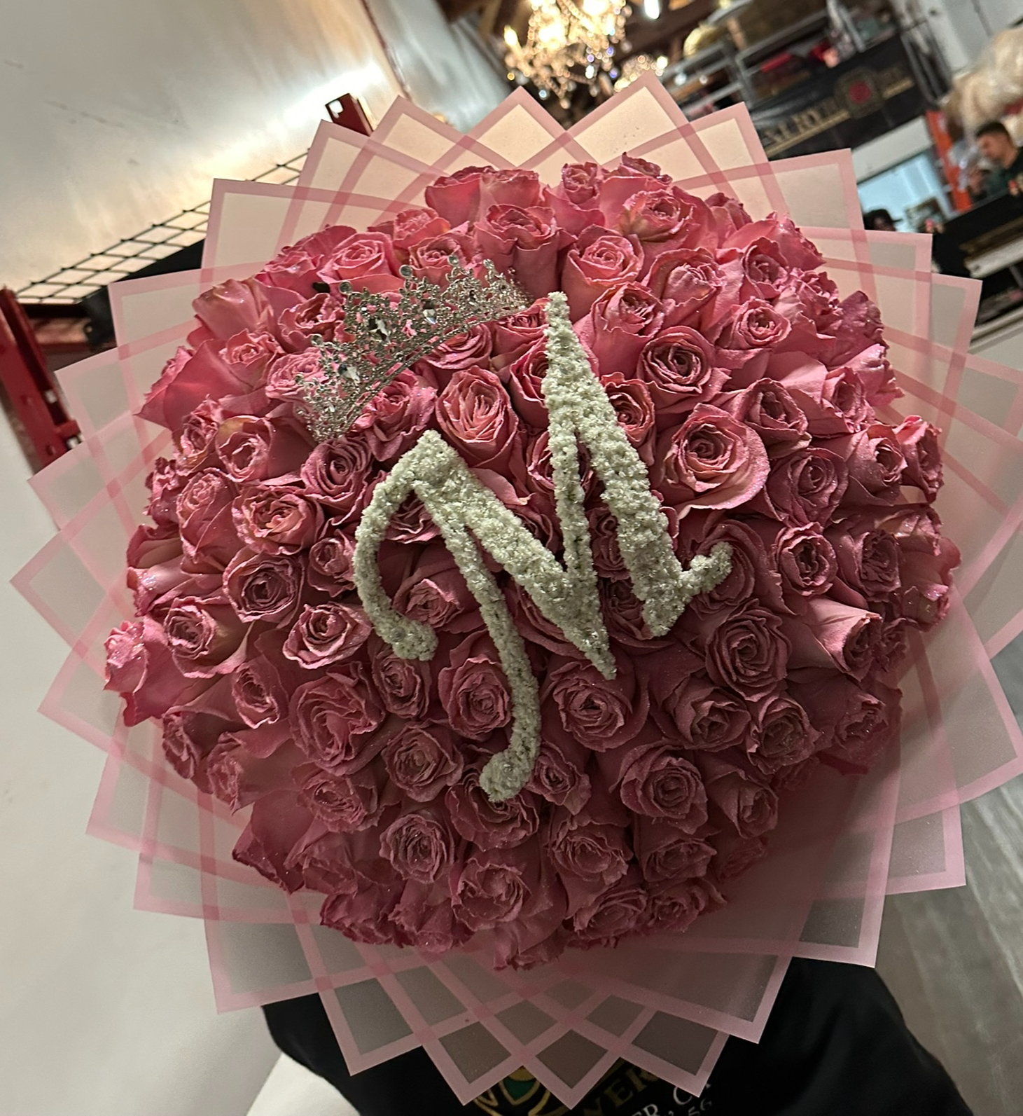 100 PINK ROSE BOUQUET WITH GLITTER AND INITIAL "M"
