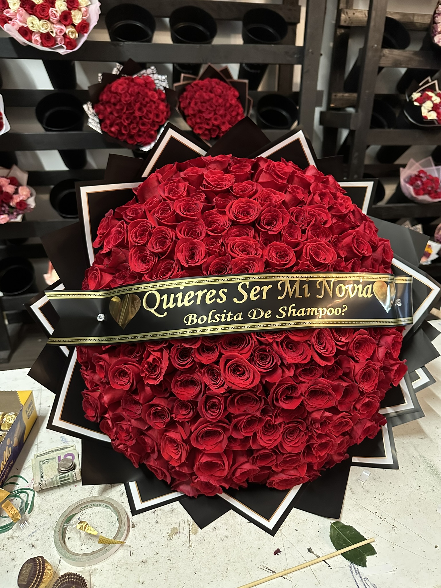 100 RED ROSE BOUQUET WITH "QUIERES SER MI NOVIA " BANNERRed Velvet $310.00PriceExcluding Sales TaxQuantity*Add to Cart