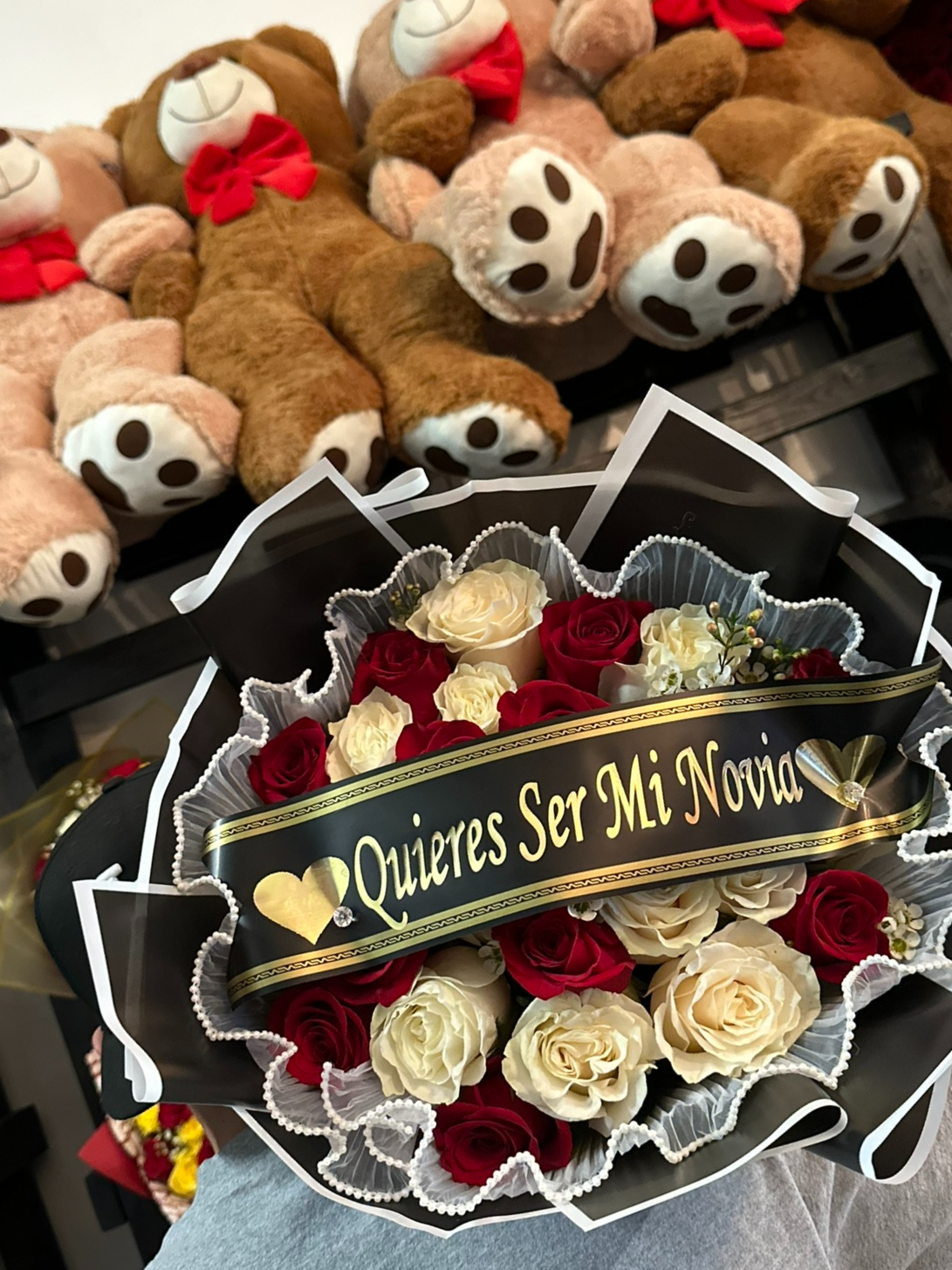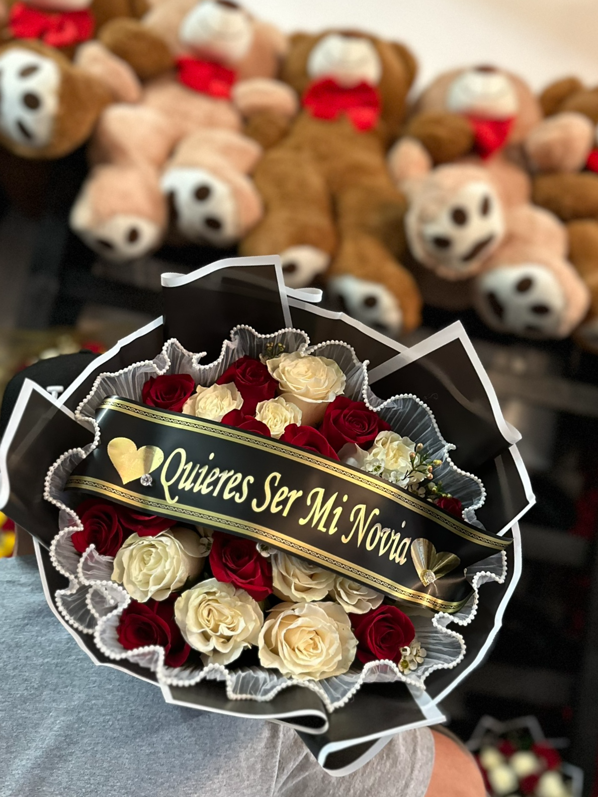 25 RED AND WHITE ROSE BOUQUET WITH TUTU AND BLK WRAP WITH BANNER INCLUDED25 ROSE BOUQUET "QUIERES SER MI NOVIA$95.00PriceExcluding Sales TaxQuantity*Add to Cart