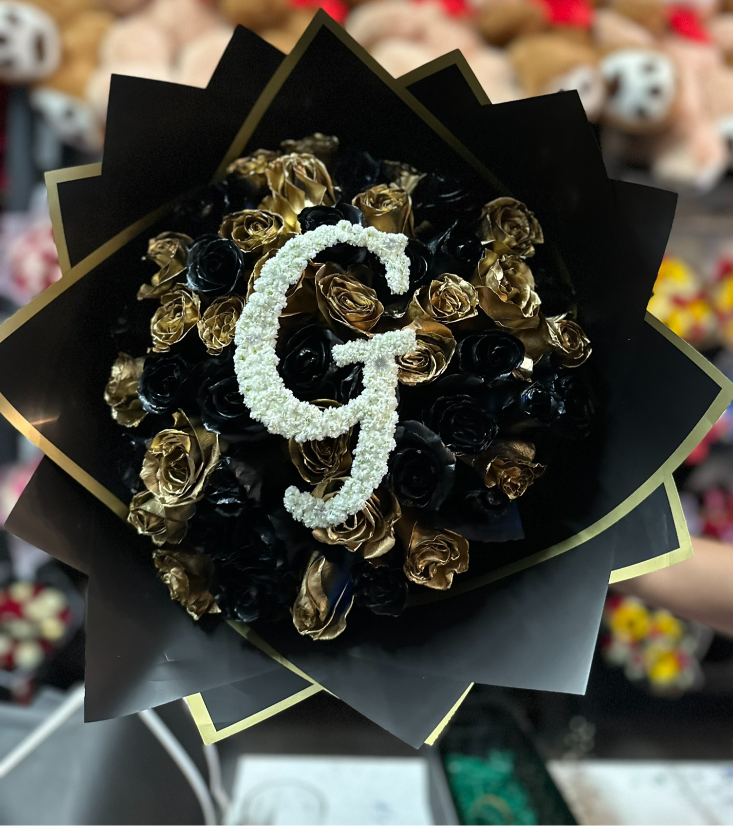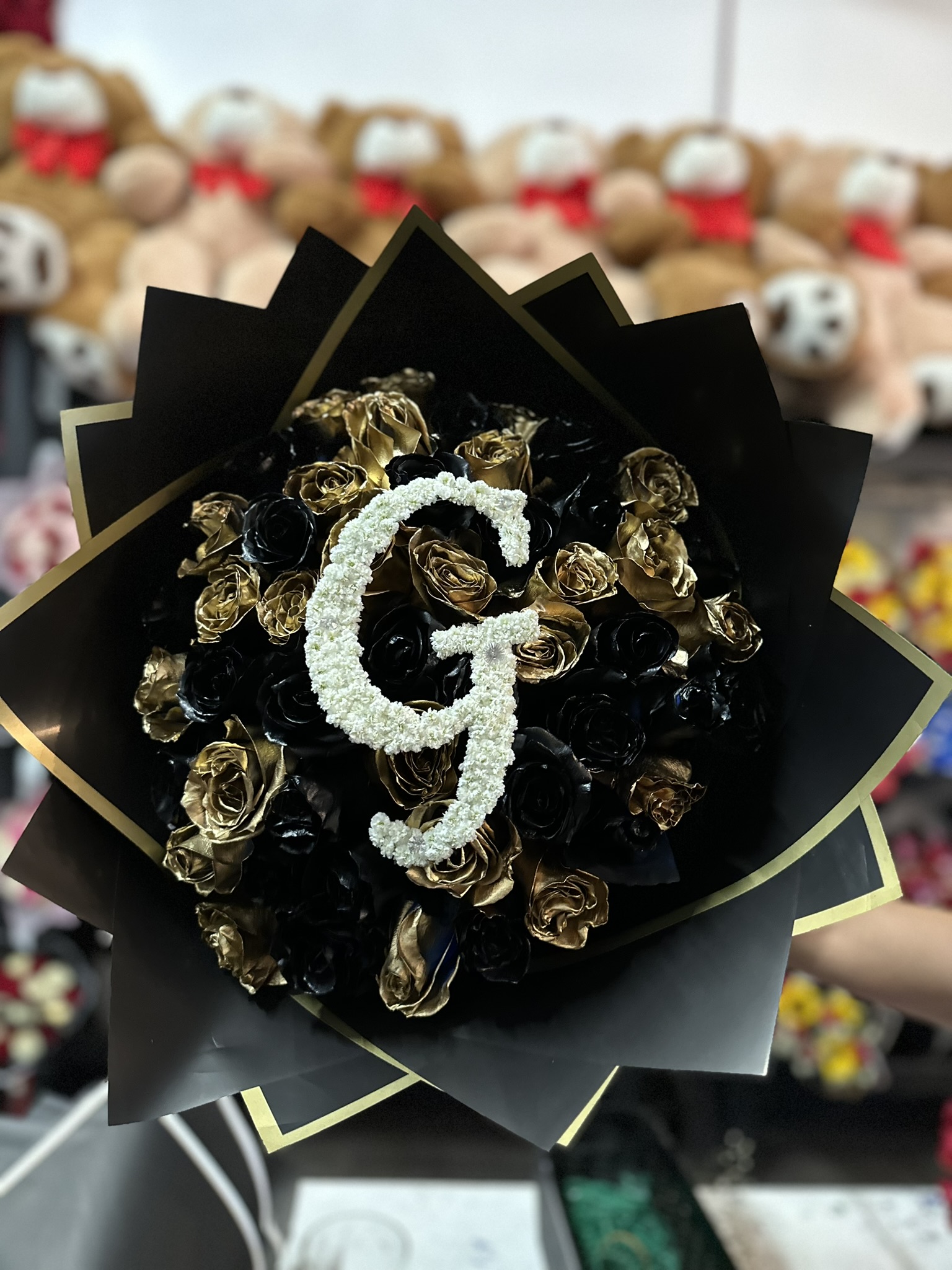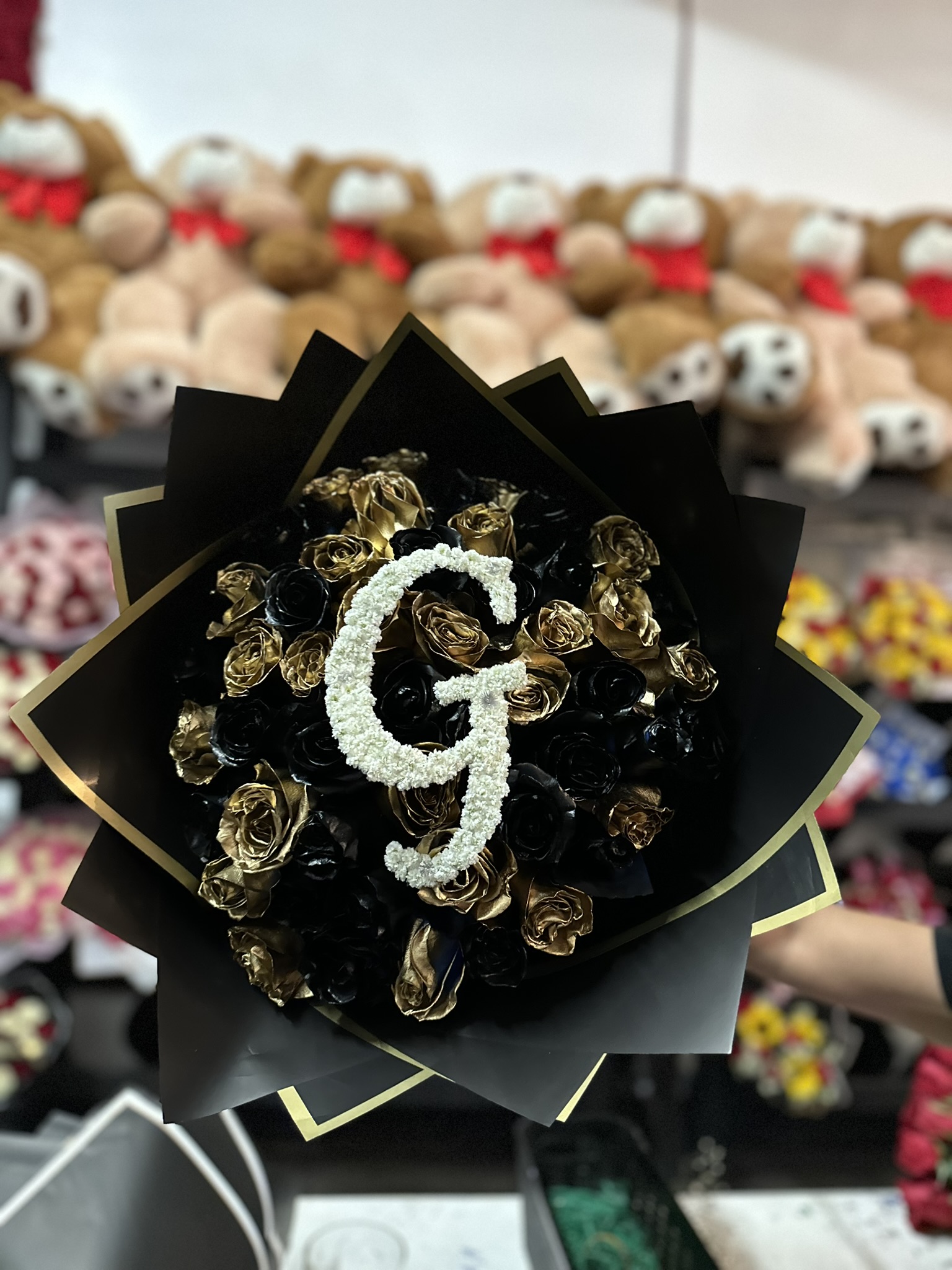 50 BLACK AND GOLD ROSE BOUQUET WITH INITIAL "G"