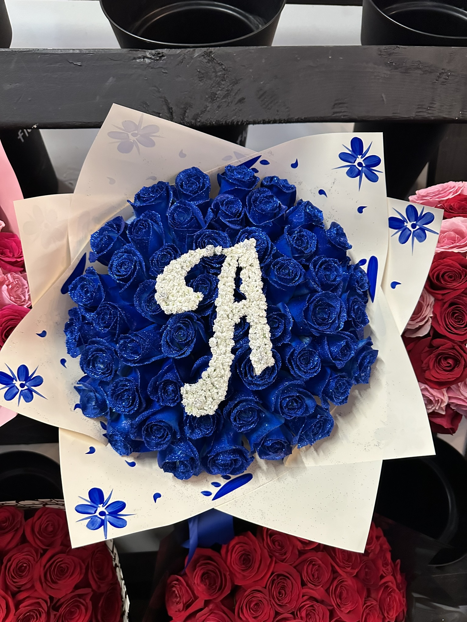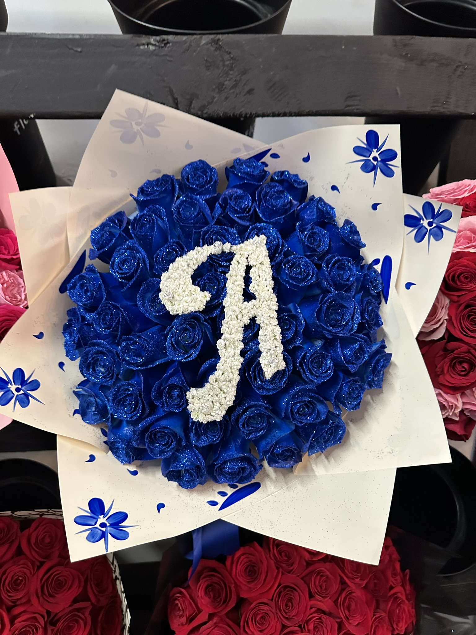 50 Blue Glitter Rose Bouquet With Initial "A"50 BLUE GLITTER ROSE BOUQUET WITH INITIAL "A"$190.00PriceExcluding Sales TaxQuantity*Add to Cart
