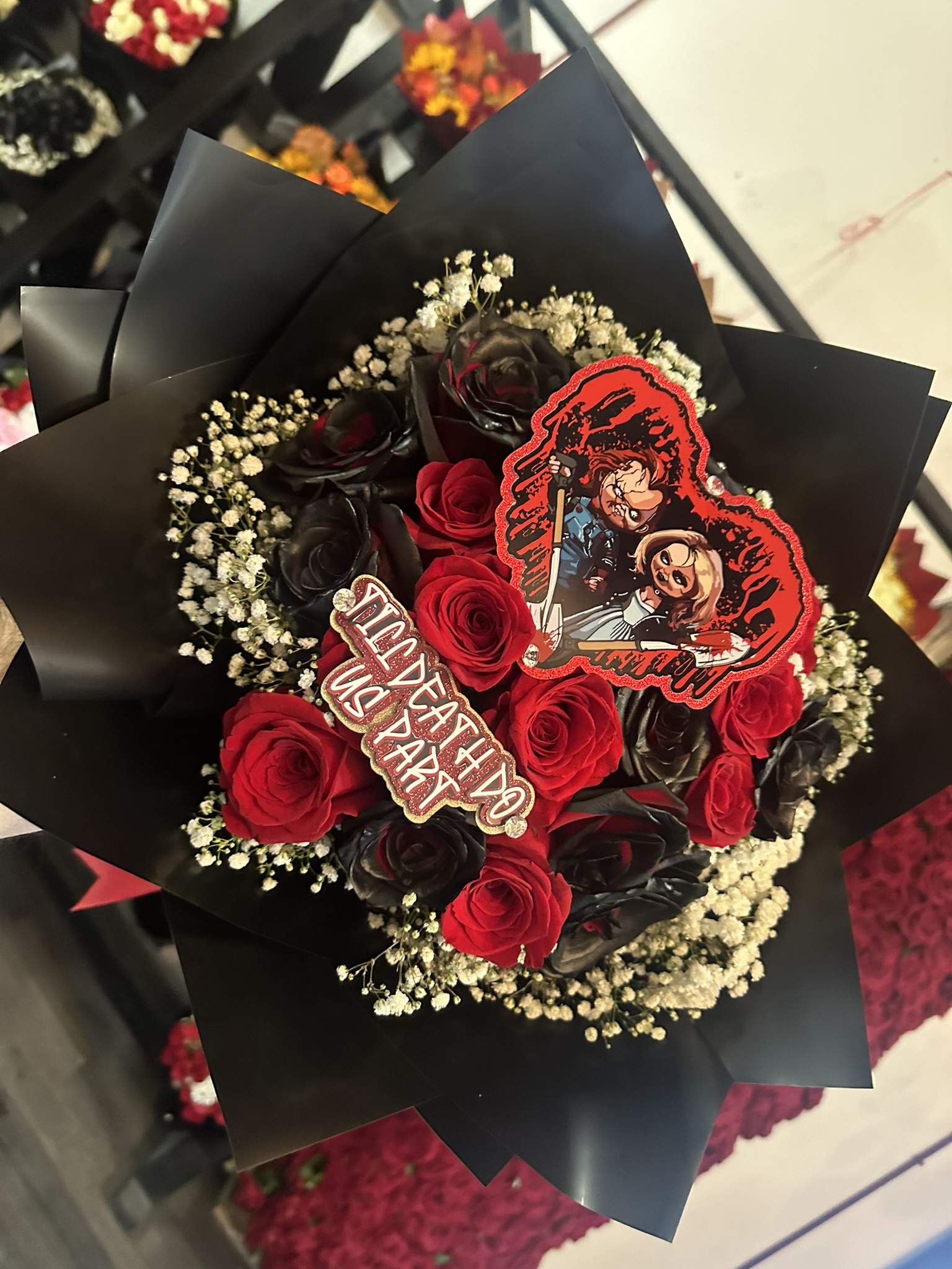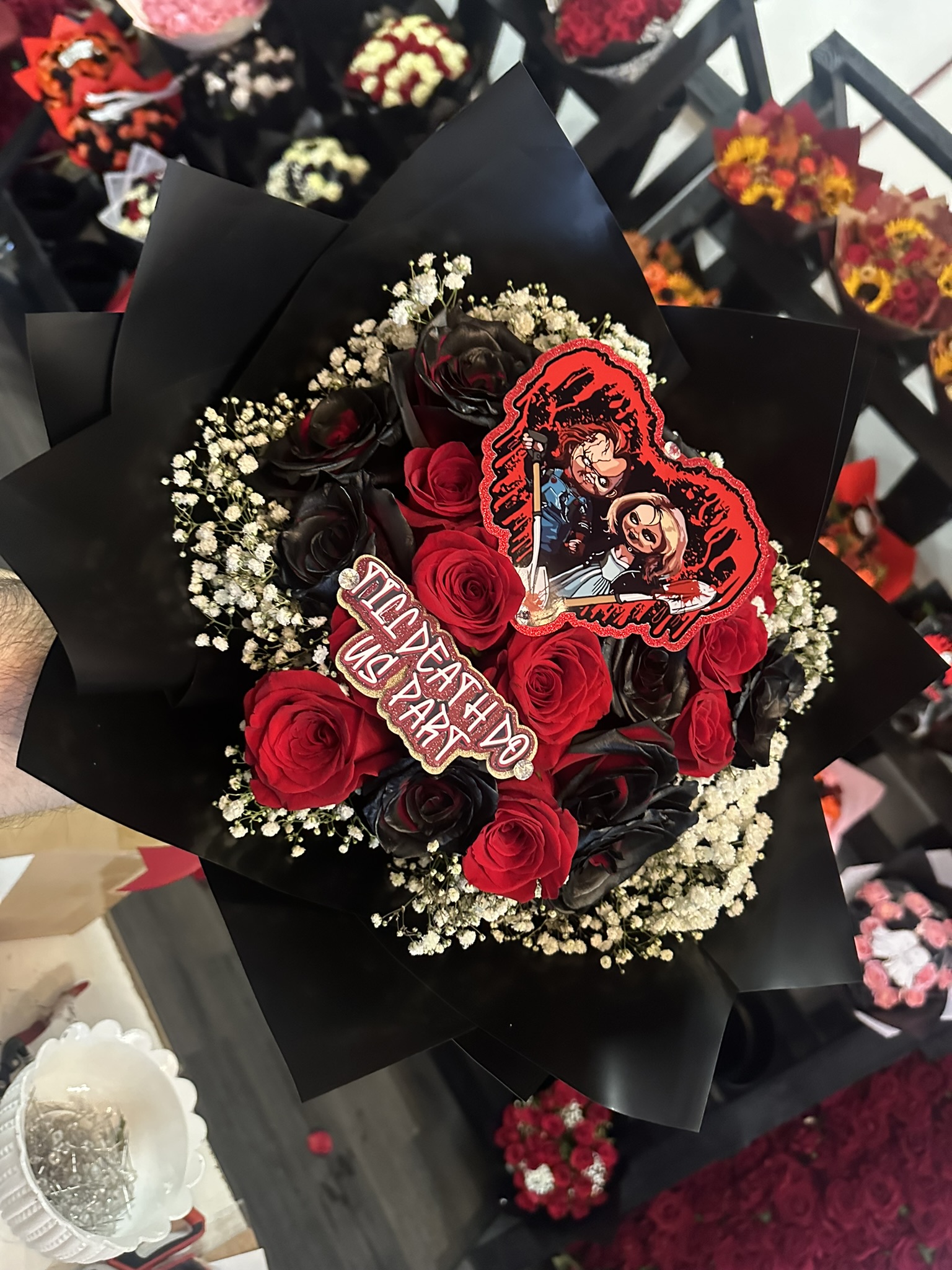 25 ROSE BOUQUET RED AND BLACK ROSES WITH BBY BREATH RIM AND "CHUCKY AND BRIDE" CUT OUT CHUCKY AND BRIDE BOUQUET$130.00PriceExcluding Sales TaxQuantity*Add to Cart