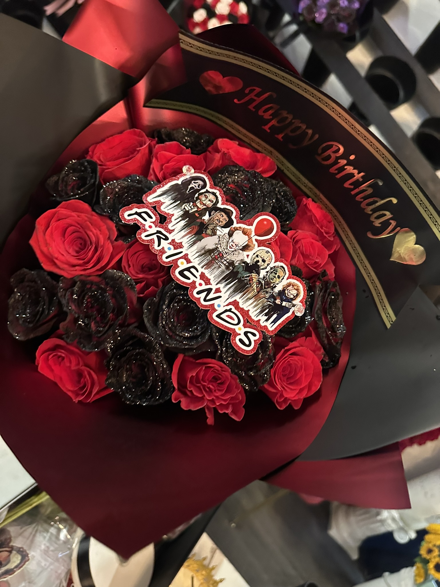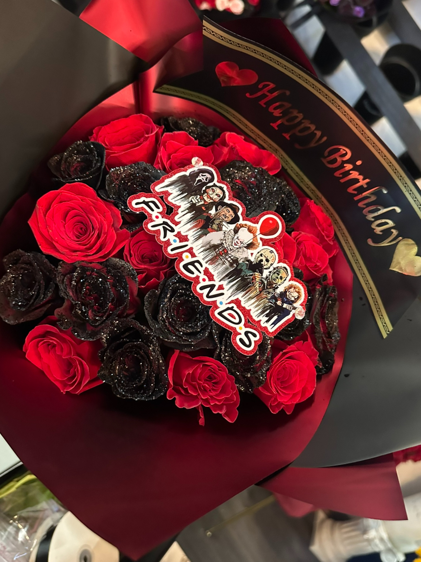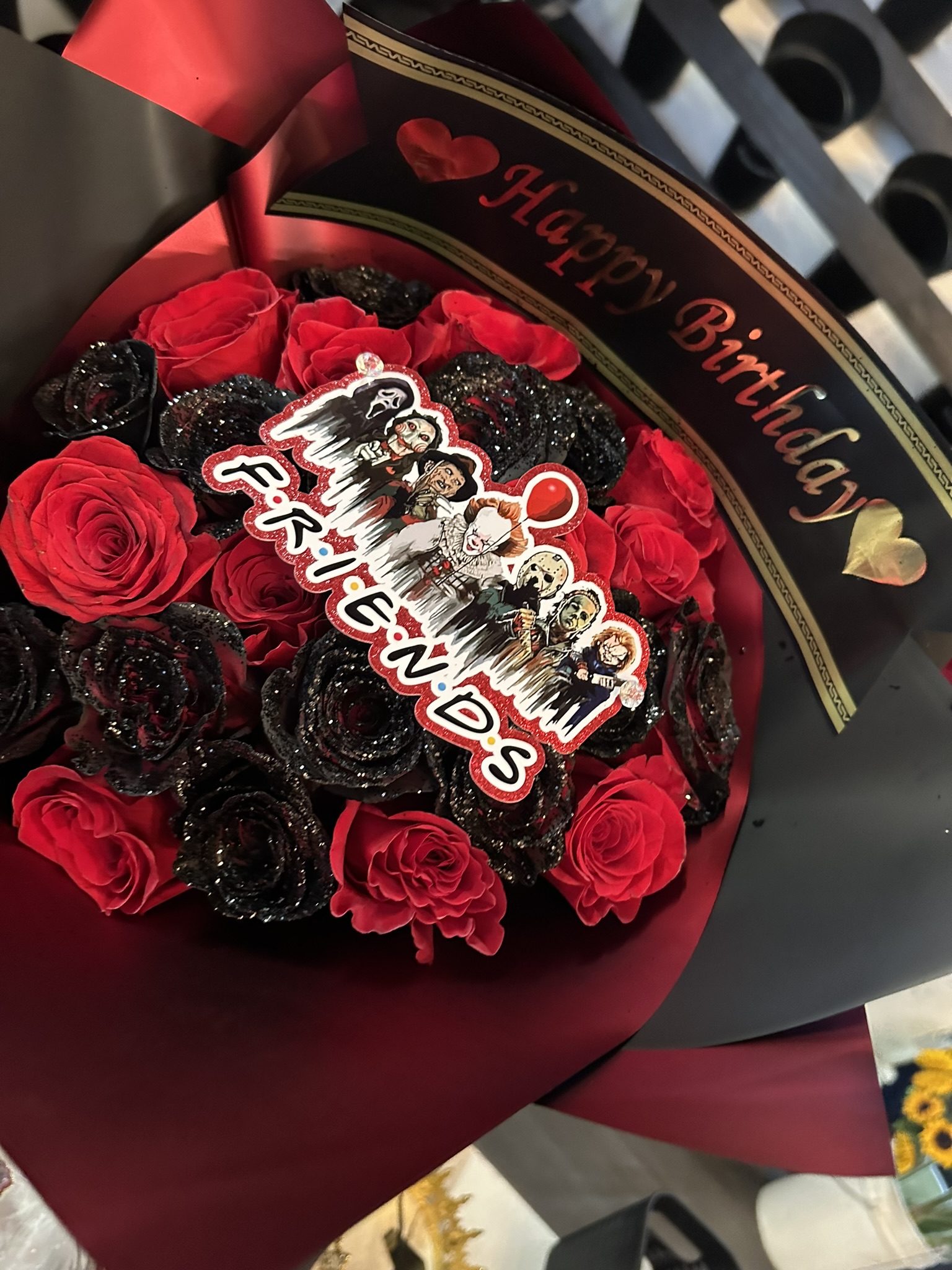 25 ROSE BOUQUET RED AND BLACK ROSES WITH "FRIENDS" CUT OUT AND BANNER INCLUDEDFRIENDS$120.00PriceExcluding Sales TaxQuantity*Add to Cart