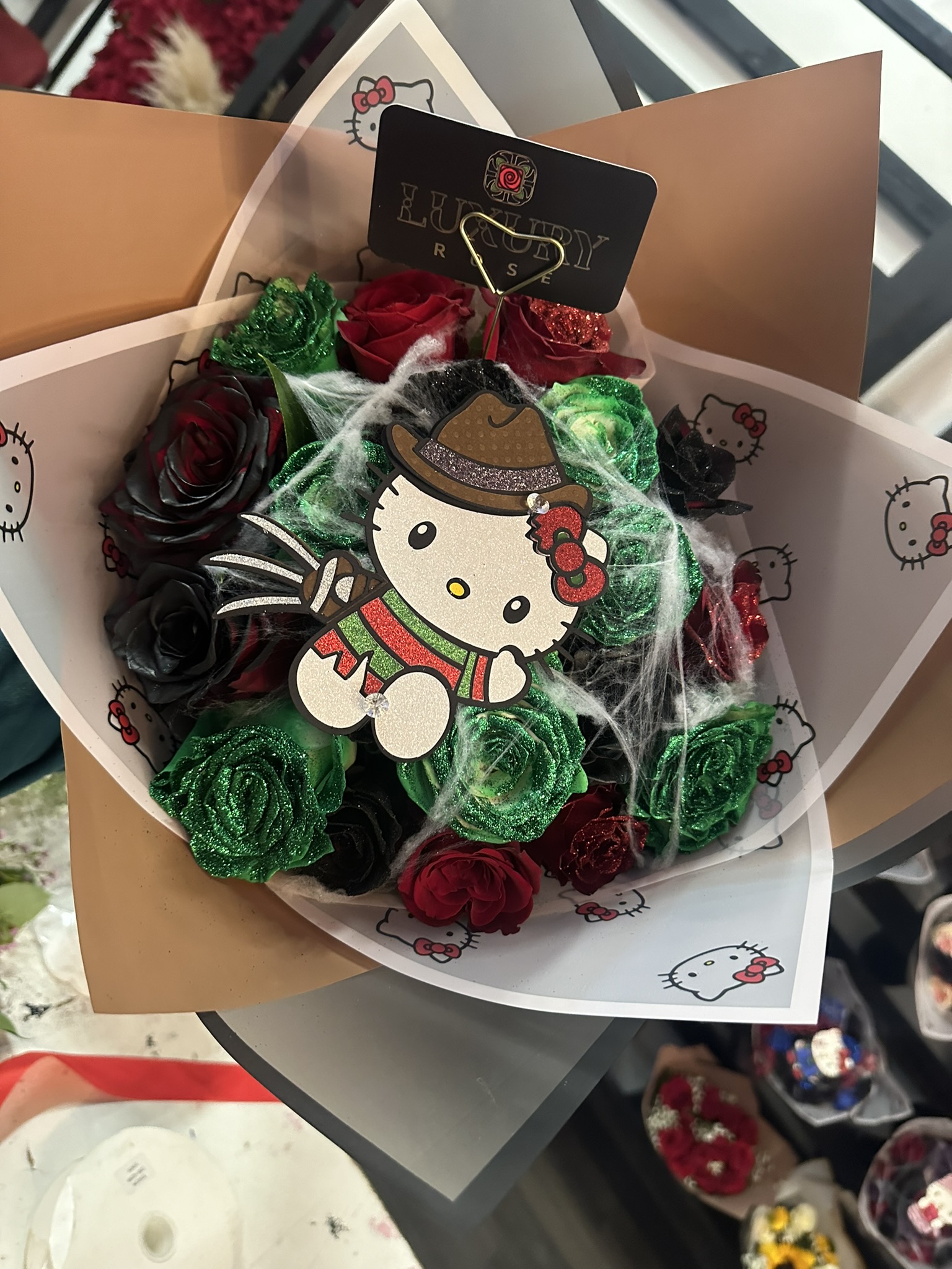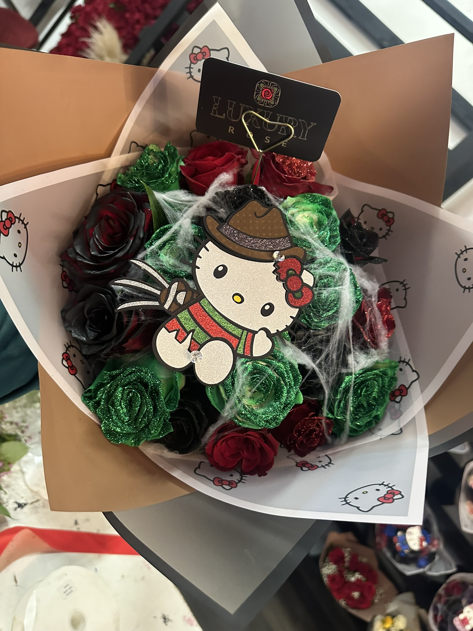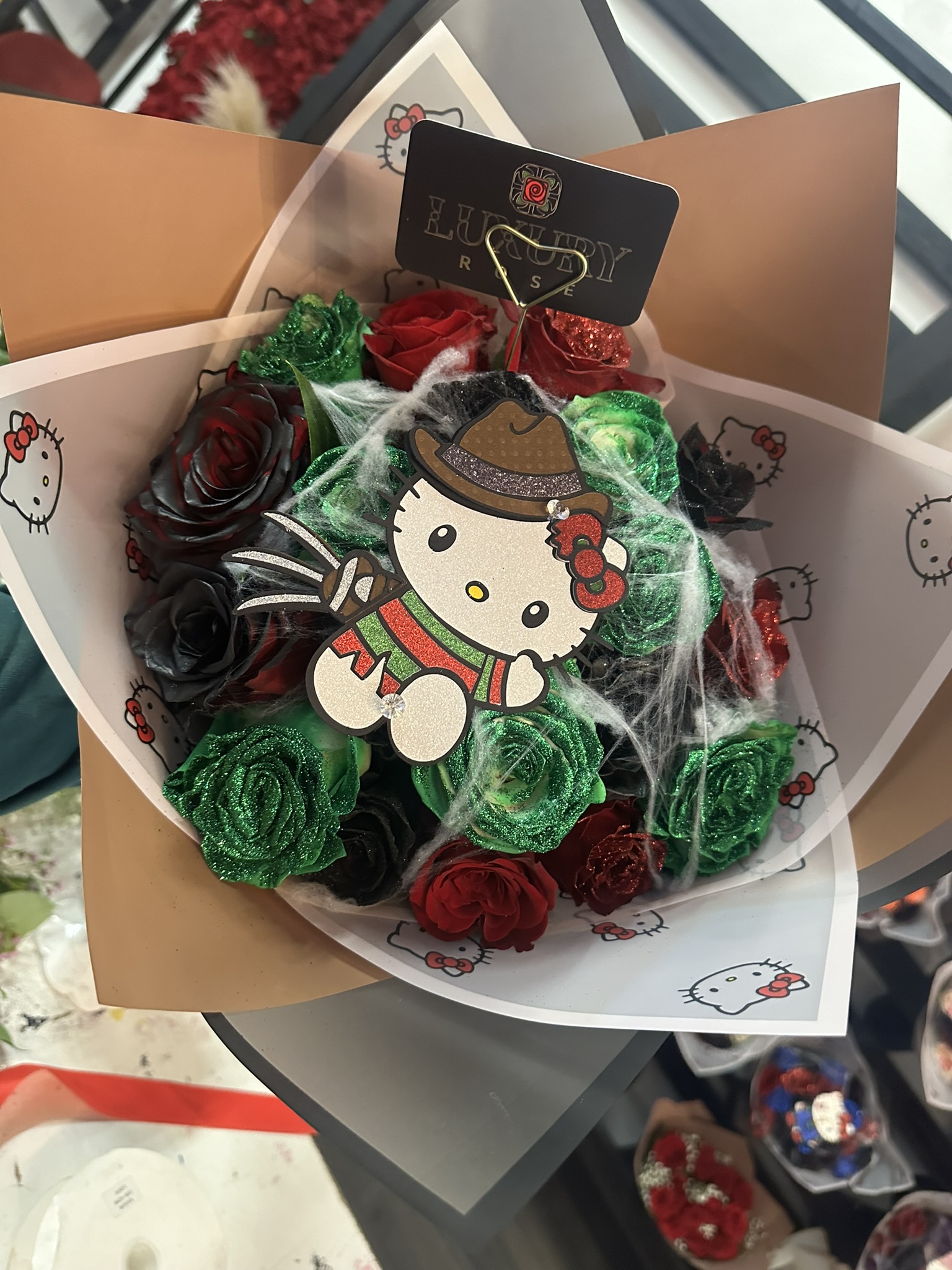 25 ROSE BOUQUET RED GREEN AND BLACK WITH WEB AND "FREDDY HELLO KITTY"CUT OUTHELLO KITTY KRUEGER BOUQUET$110.00PriceExcluding Sales TaxQuantity*Add to Cart