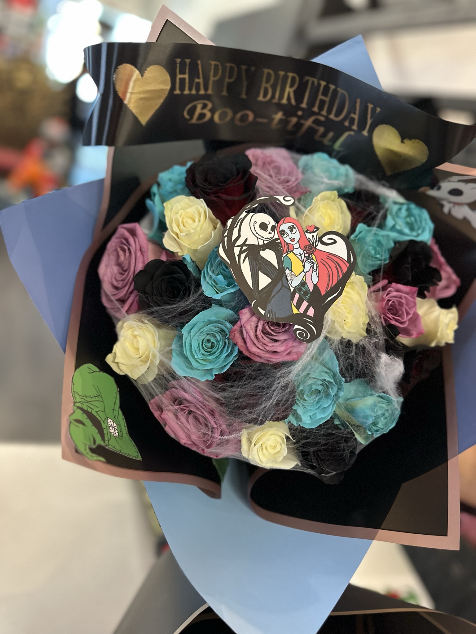 25 ROSE BOUQUET TEAL BLACK WHITE AND PURPLE ROSES WITH WEB AND "JACK AND SALLY" CUT OUT BANNER INCLUDED