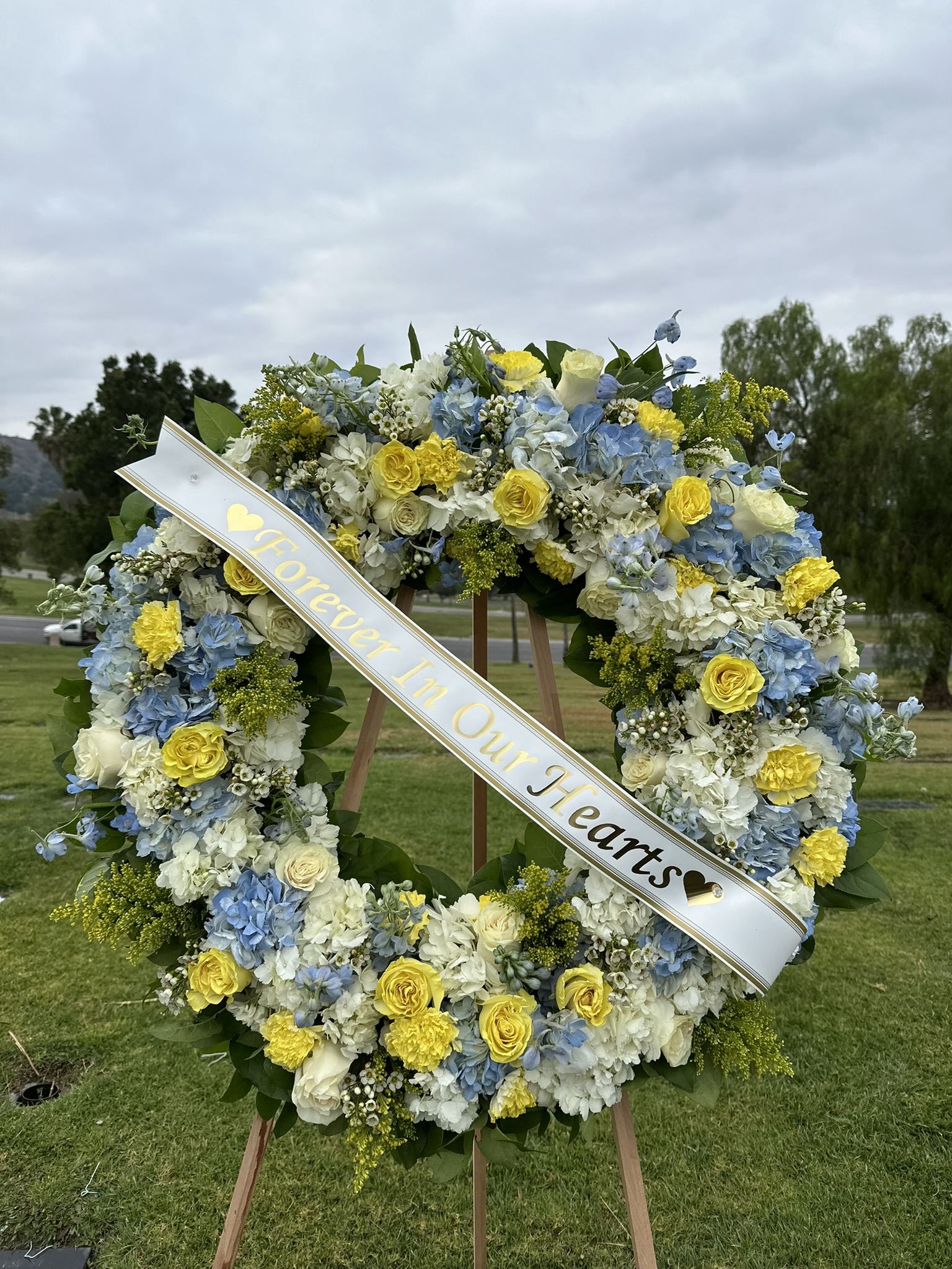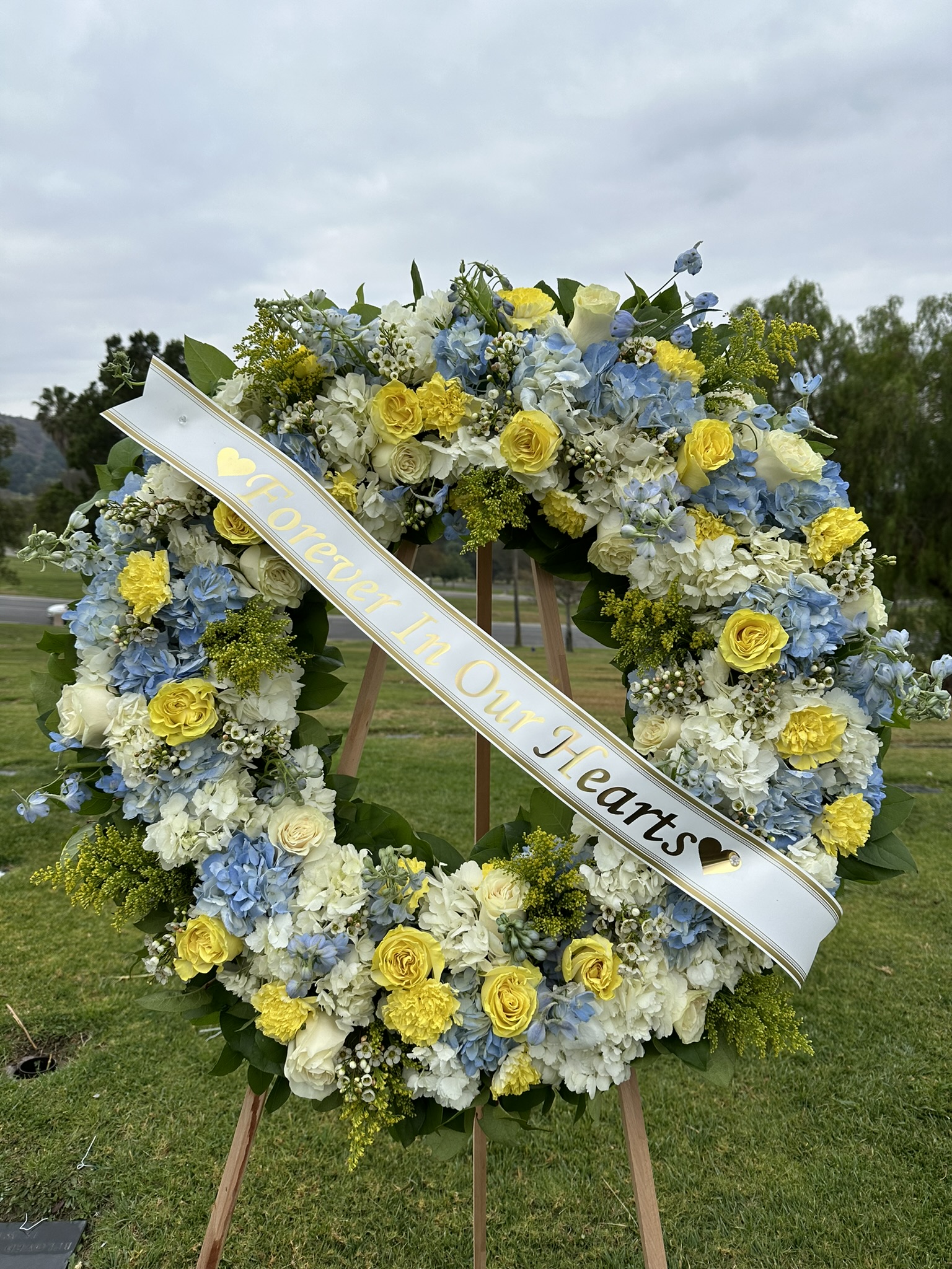 Large Circle Wreath Yellow And Baby Blue ThemeLARGE FUNERAL CIRCLE WREATH$380.00PriceExcluding Sales TaxQuantity*Add to Cart