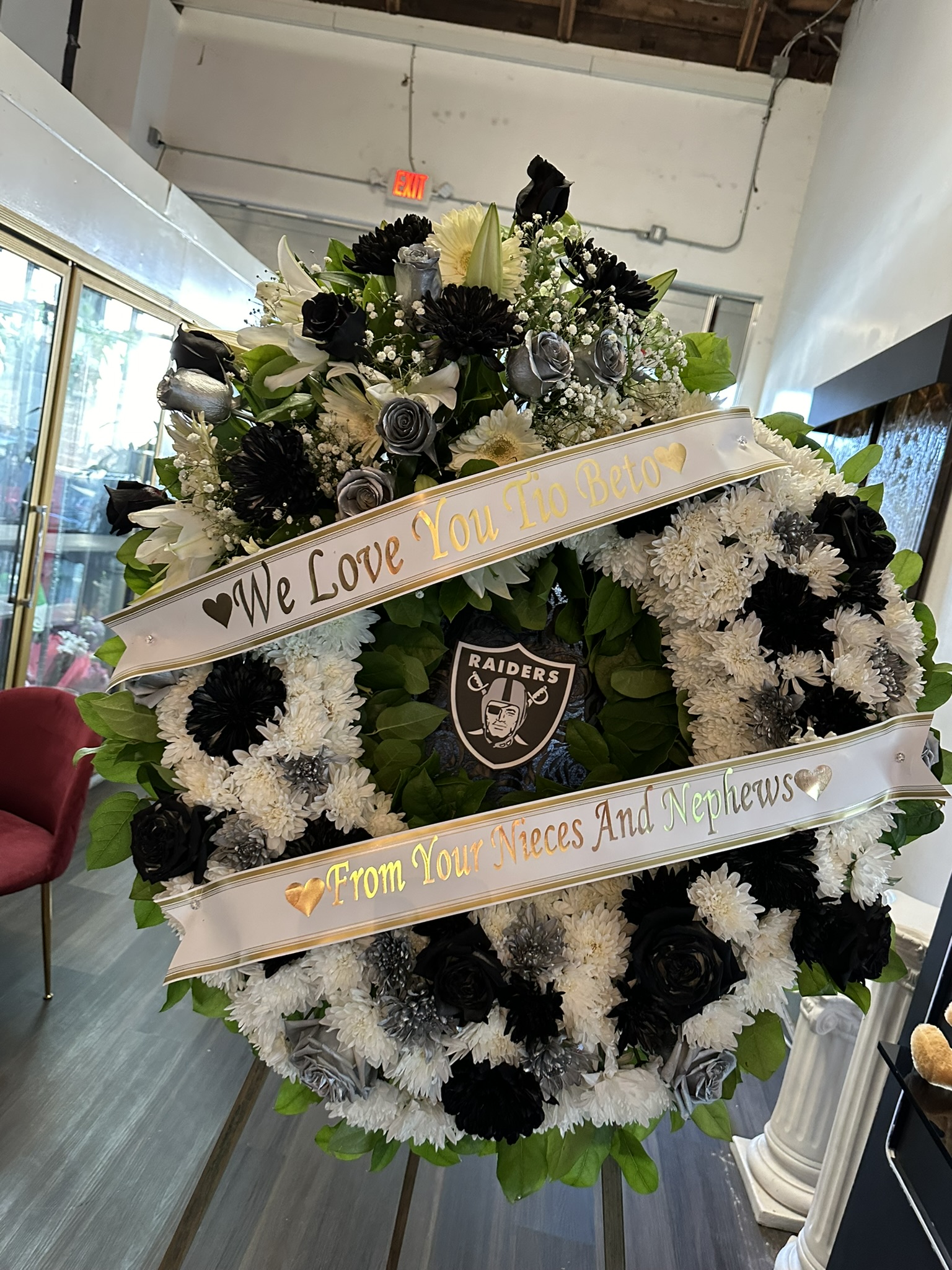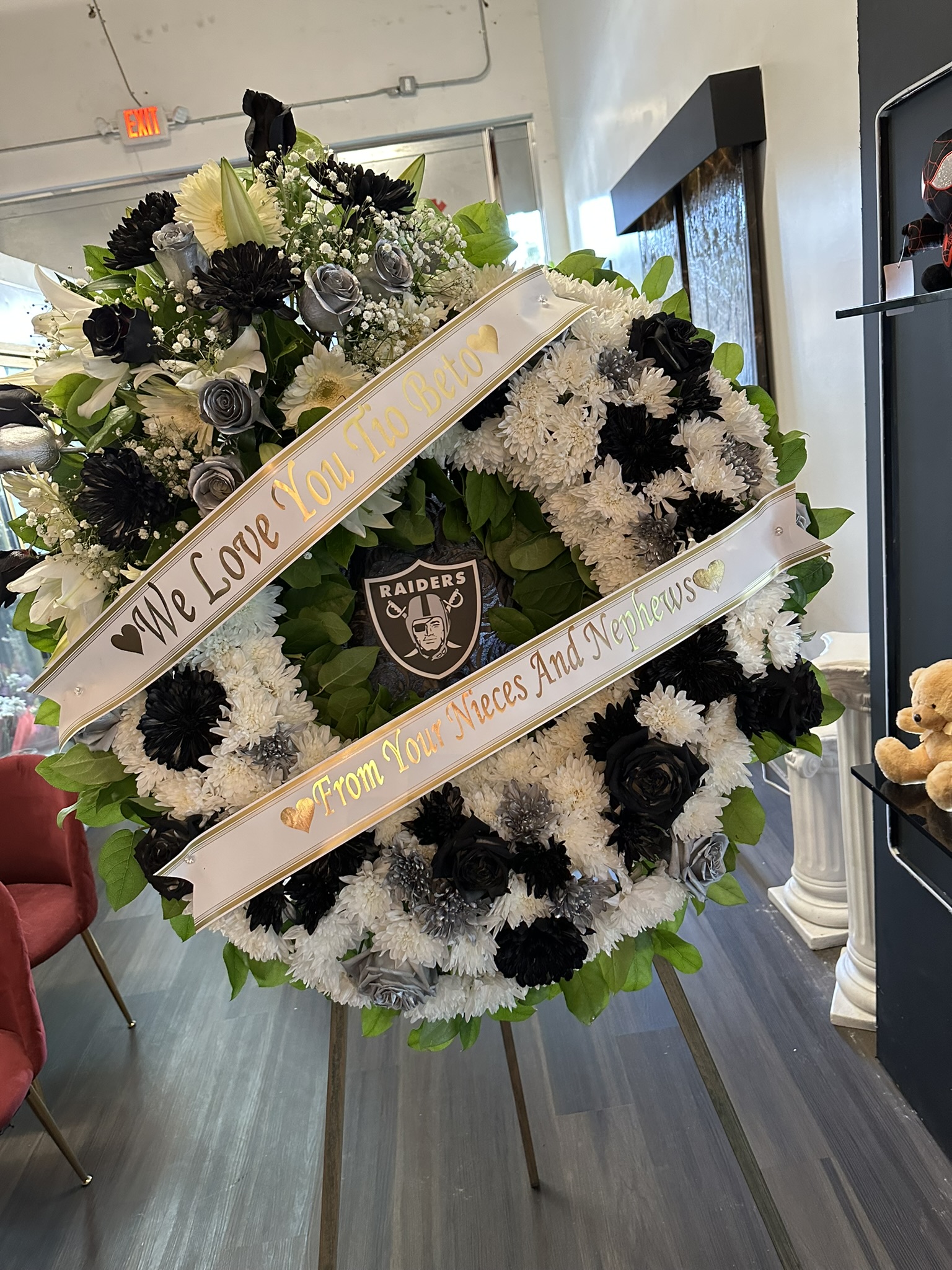 LargeNFL "RAIDERS" THEMED standing spray LARGE- SPORTS NFL "RAIDERS" WREATH$390.00PriceExcluding Sales TaxQuantity*Add to Cart
