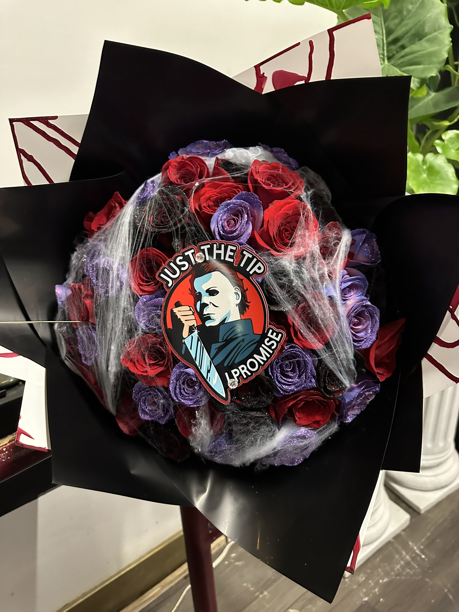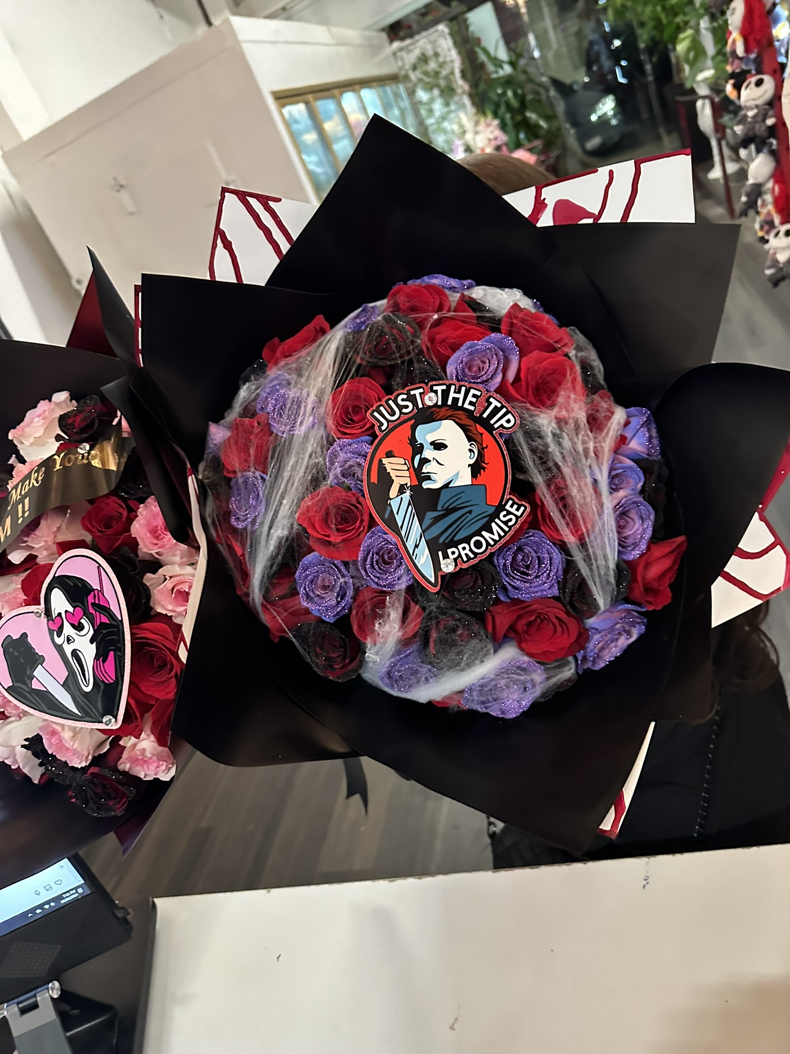 50 ROSE BOUQUET RED BLACK PURPLE WITH WEB AND "MICHAEL MYERS" CUT OUT MICHAEL MYERS BOUQUET$180.00PriceExcluding Sales TaxQuantity*Add to Cart
