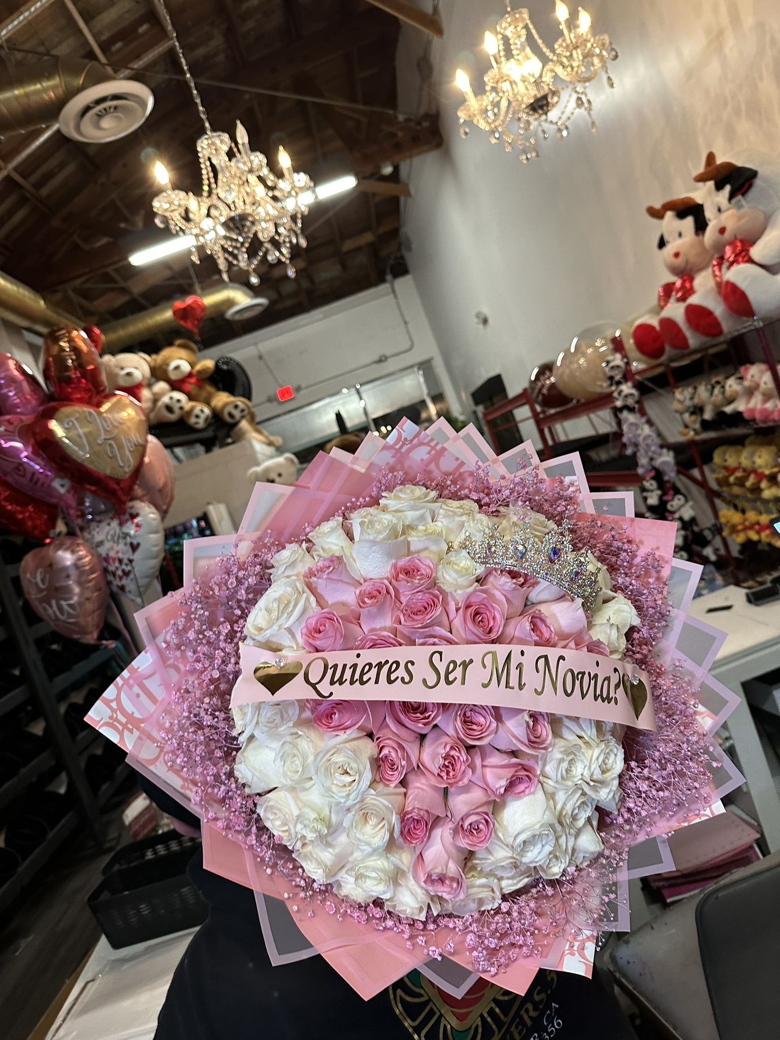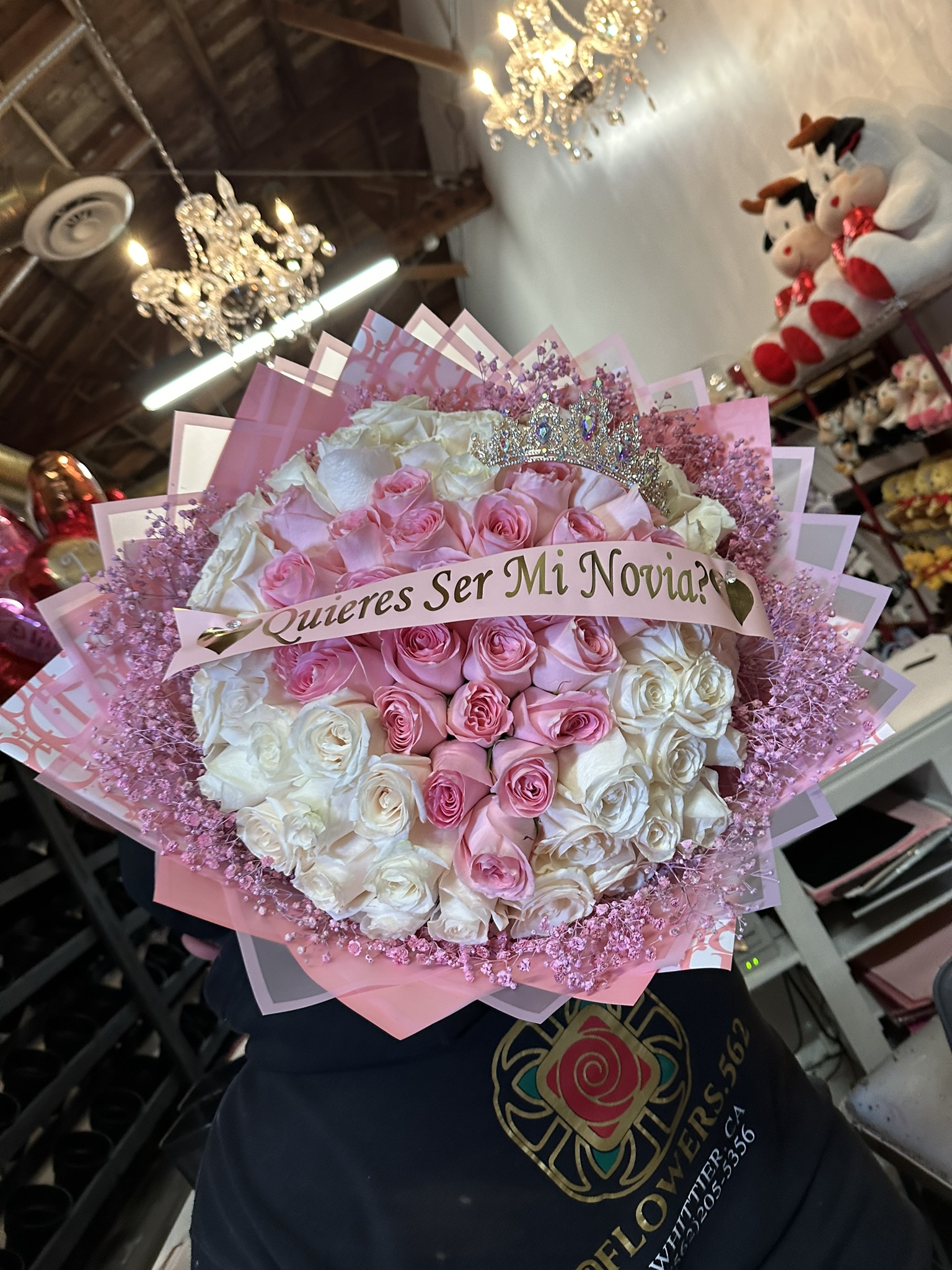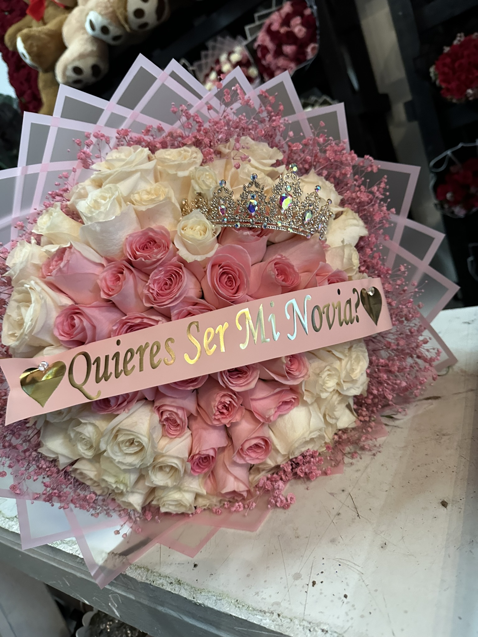 75 ROSE BOUQUET PINK AND WHITE WITH A HEART SHAPED IN THE CENTER AND PINK BABY BREATH AROUND,BANNER LUX CROWN INCLUDED