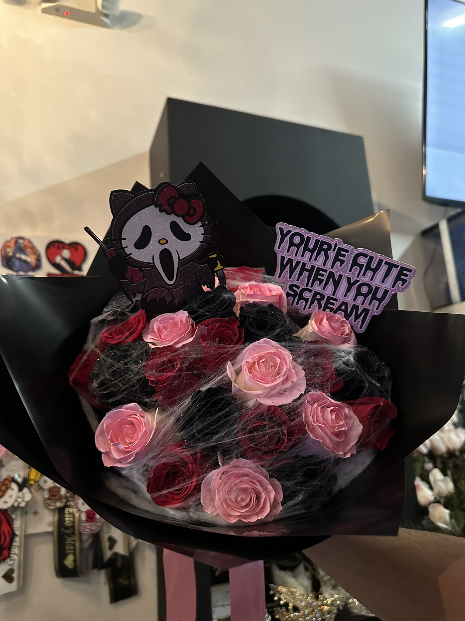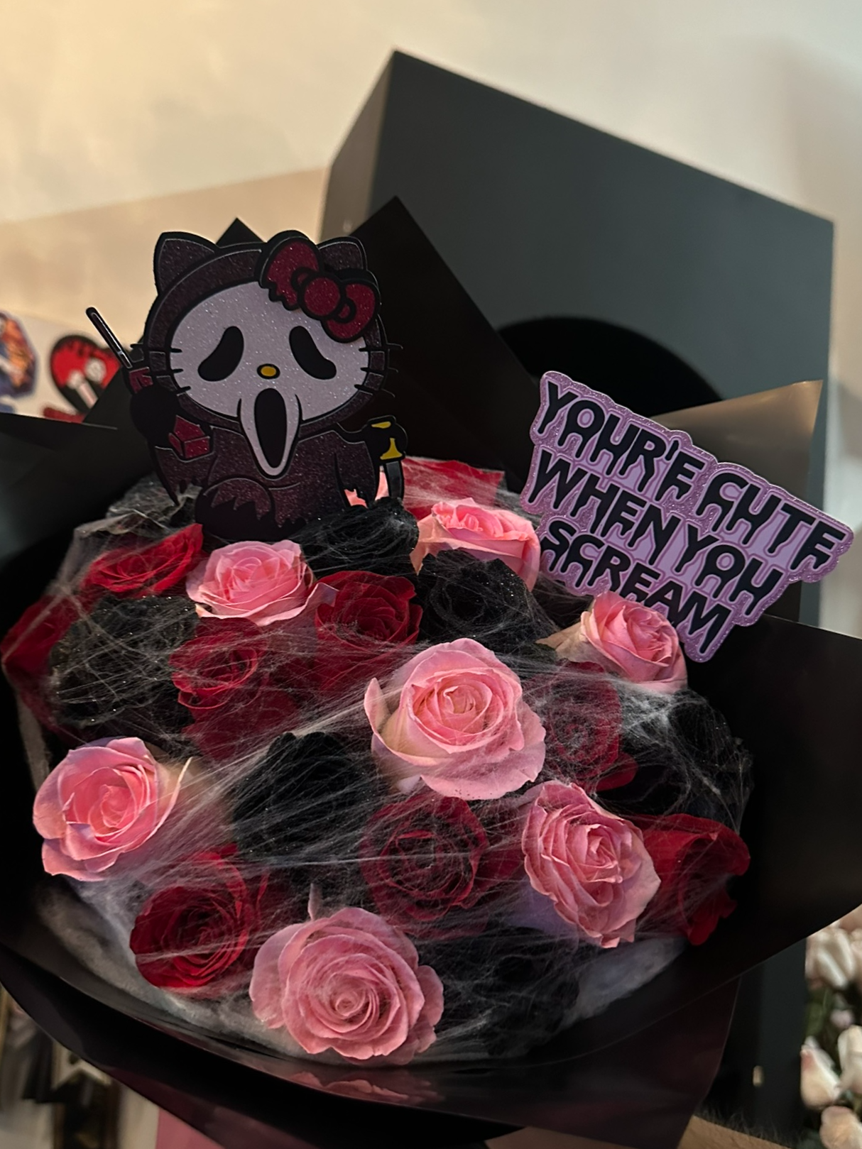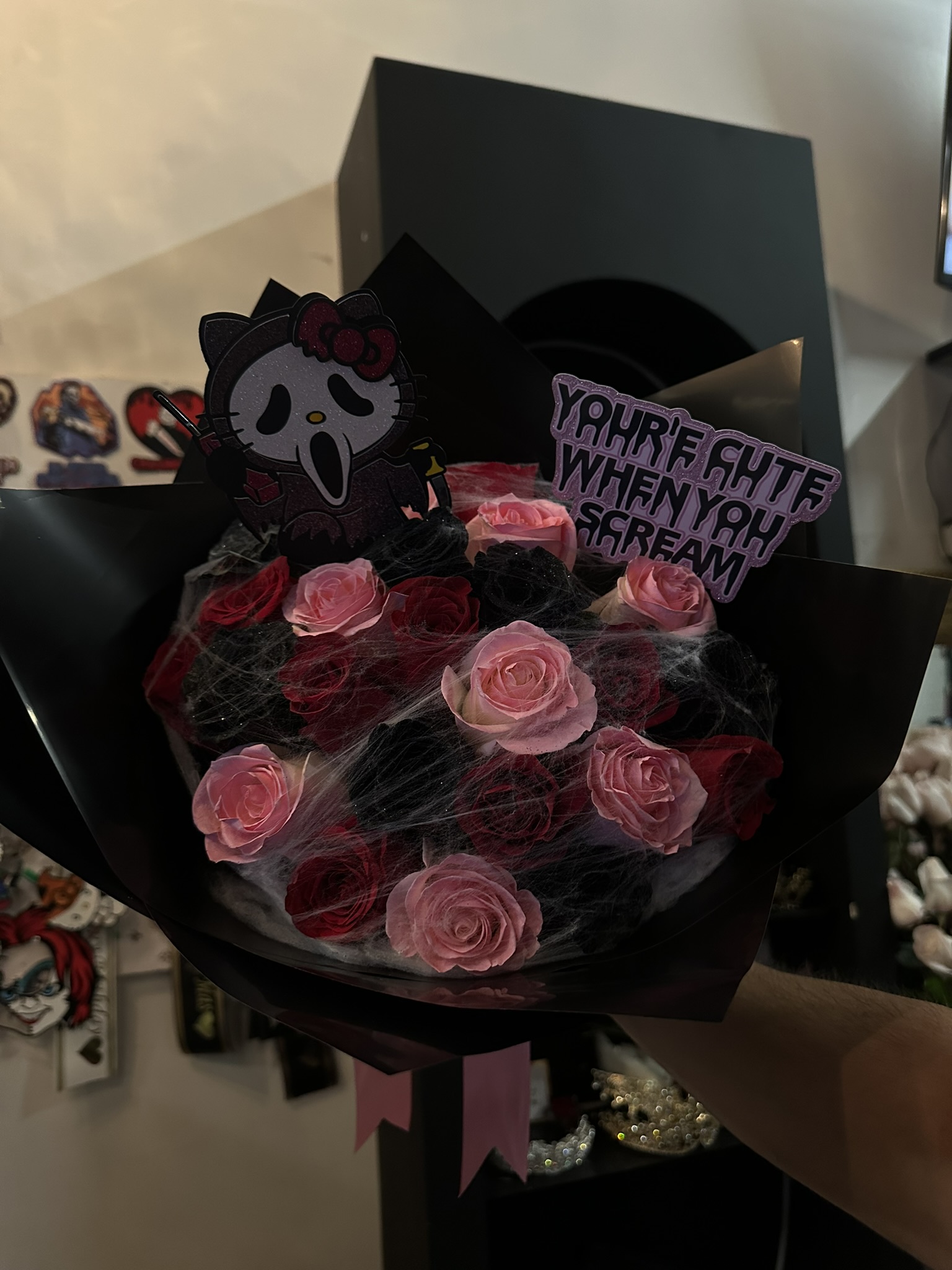 25 ROSE BOUQUET PINK RED AND BLACK WITH WEB AND "SCREAM PHONE" CUT OUTSCREAM PHONE BOUQUET$120.00PriceExcluding Sales TaxQuantity*Add to Cart