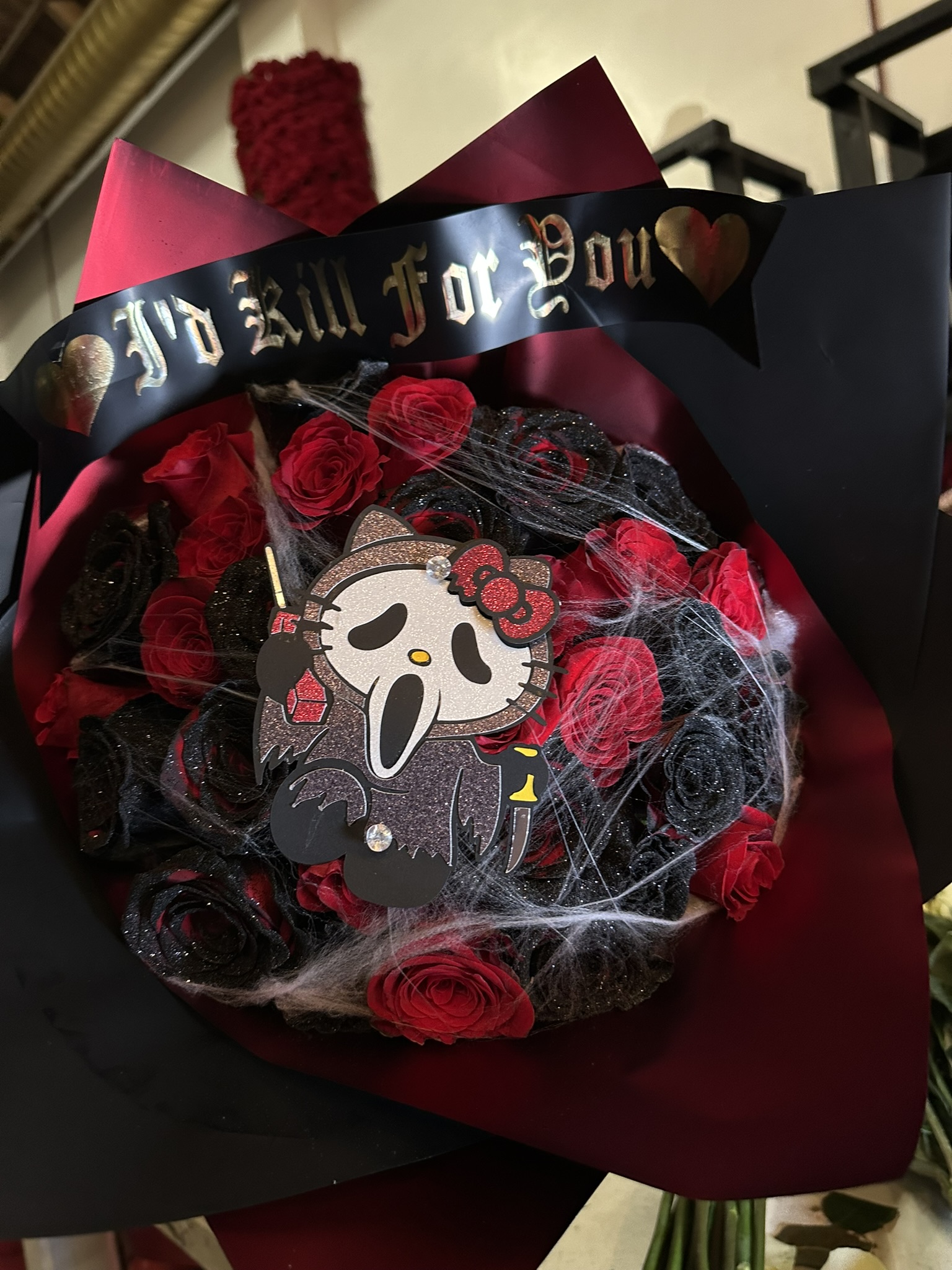 25 BLACK AND RED ROSE BOUQUET WITH WEB "SCREAM" CUT OUT AND BANNER INCLUDEDSCREAM PHONE WITH KNIFESPOOKY BOUQUET$130.00PriceExcluding Sales TaxQuantity*Add to Cart