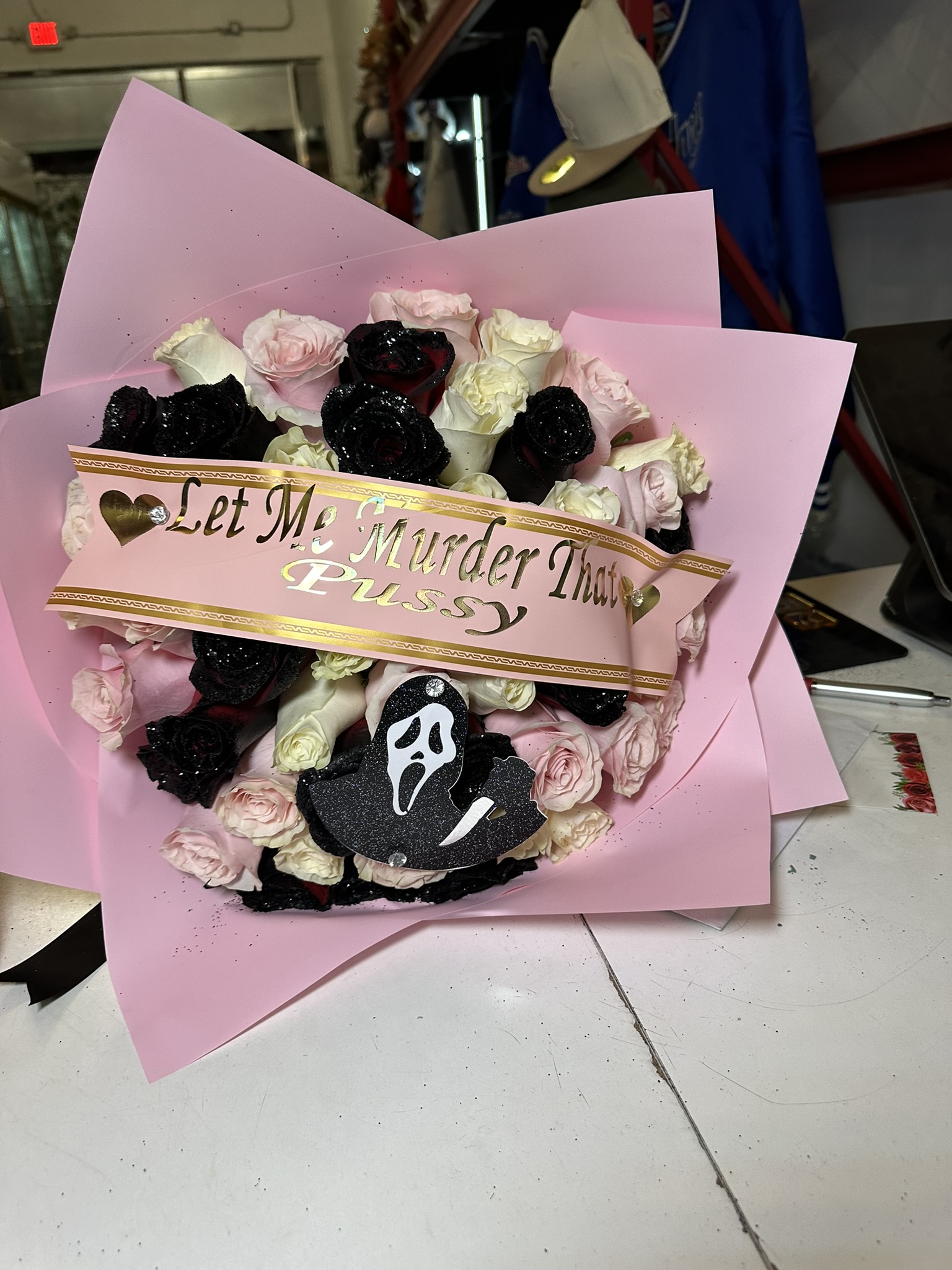 50 ROSE BOUQUET PINK WHITE BLACK WITH "SCREAM" CUT OUT AND BANNER INCLUDEDSCREAMING FOR LOVE$180.00PriceExcluding Sales TaxQuantity*Add to Cart