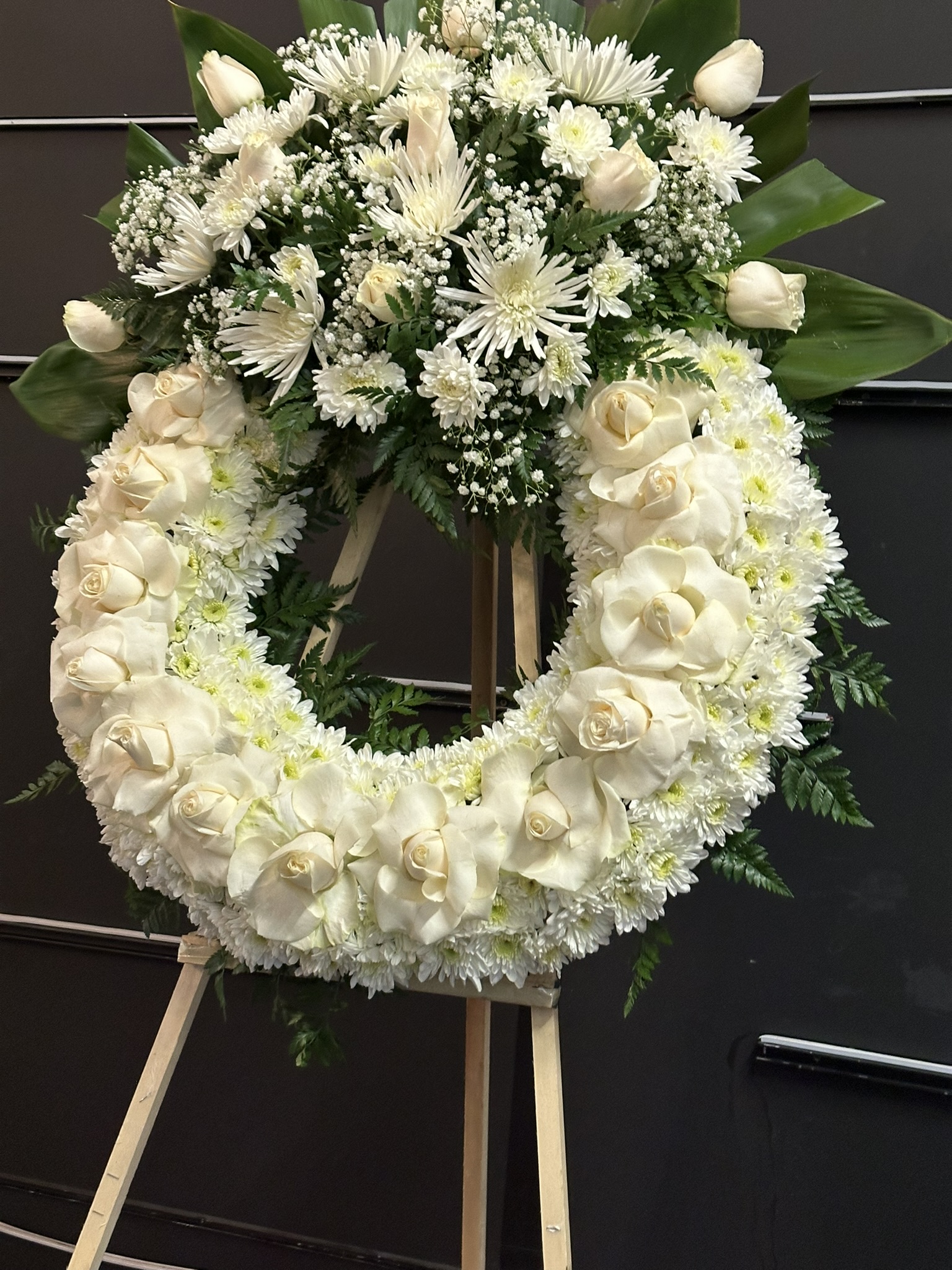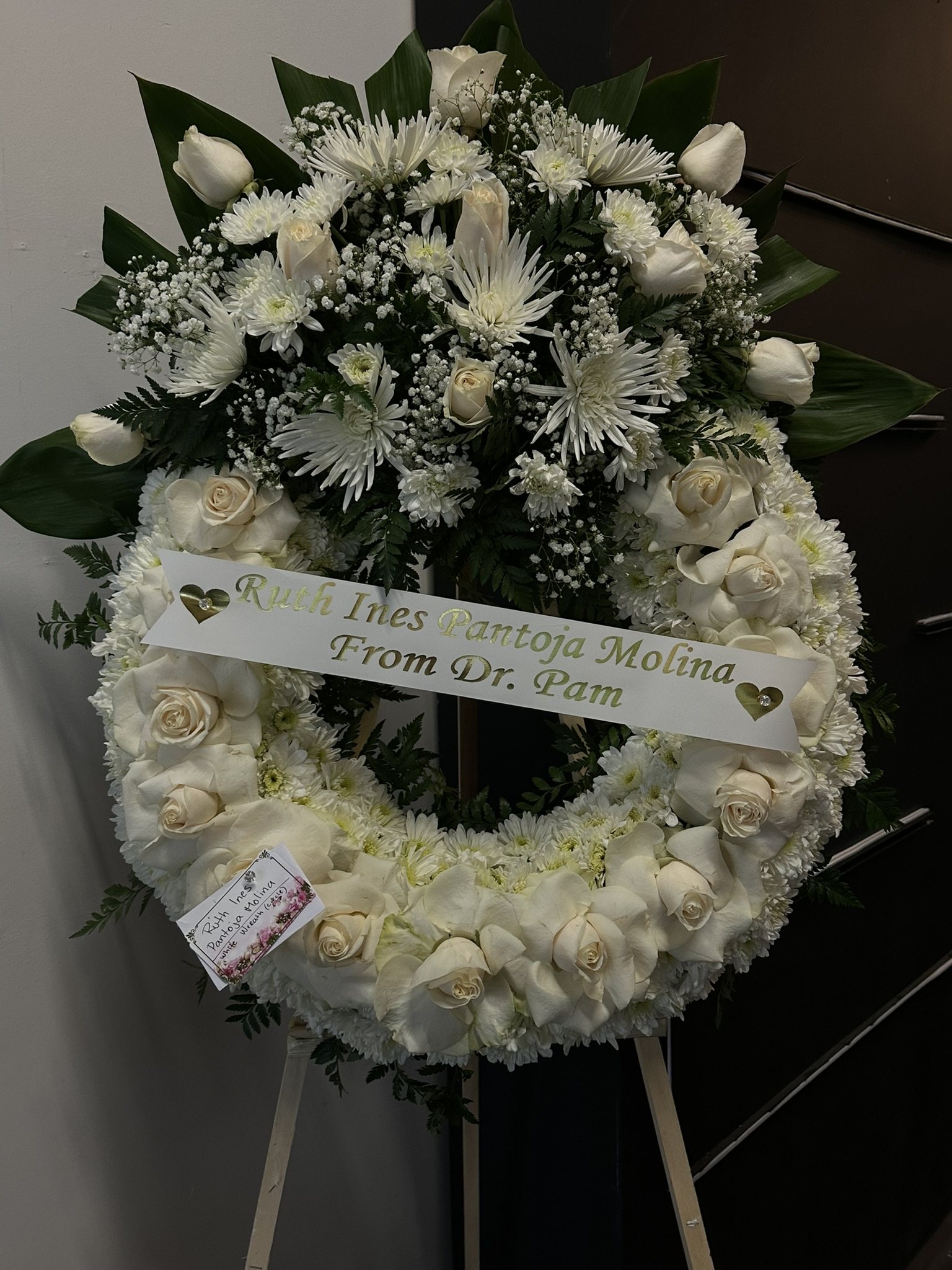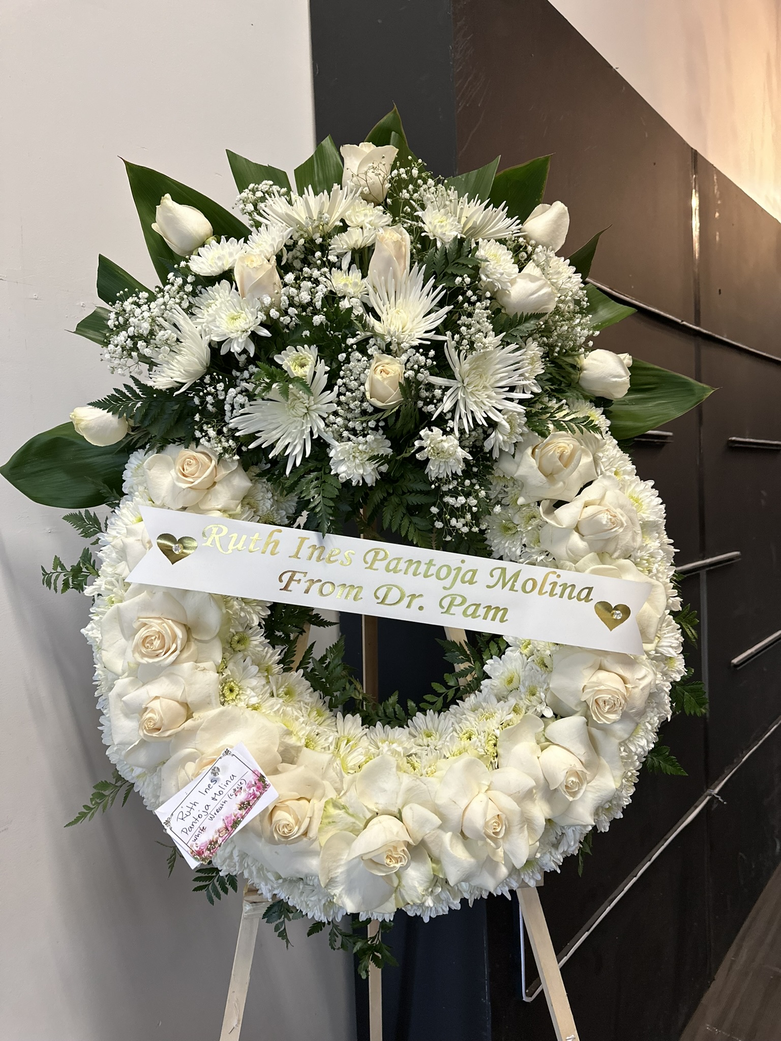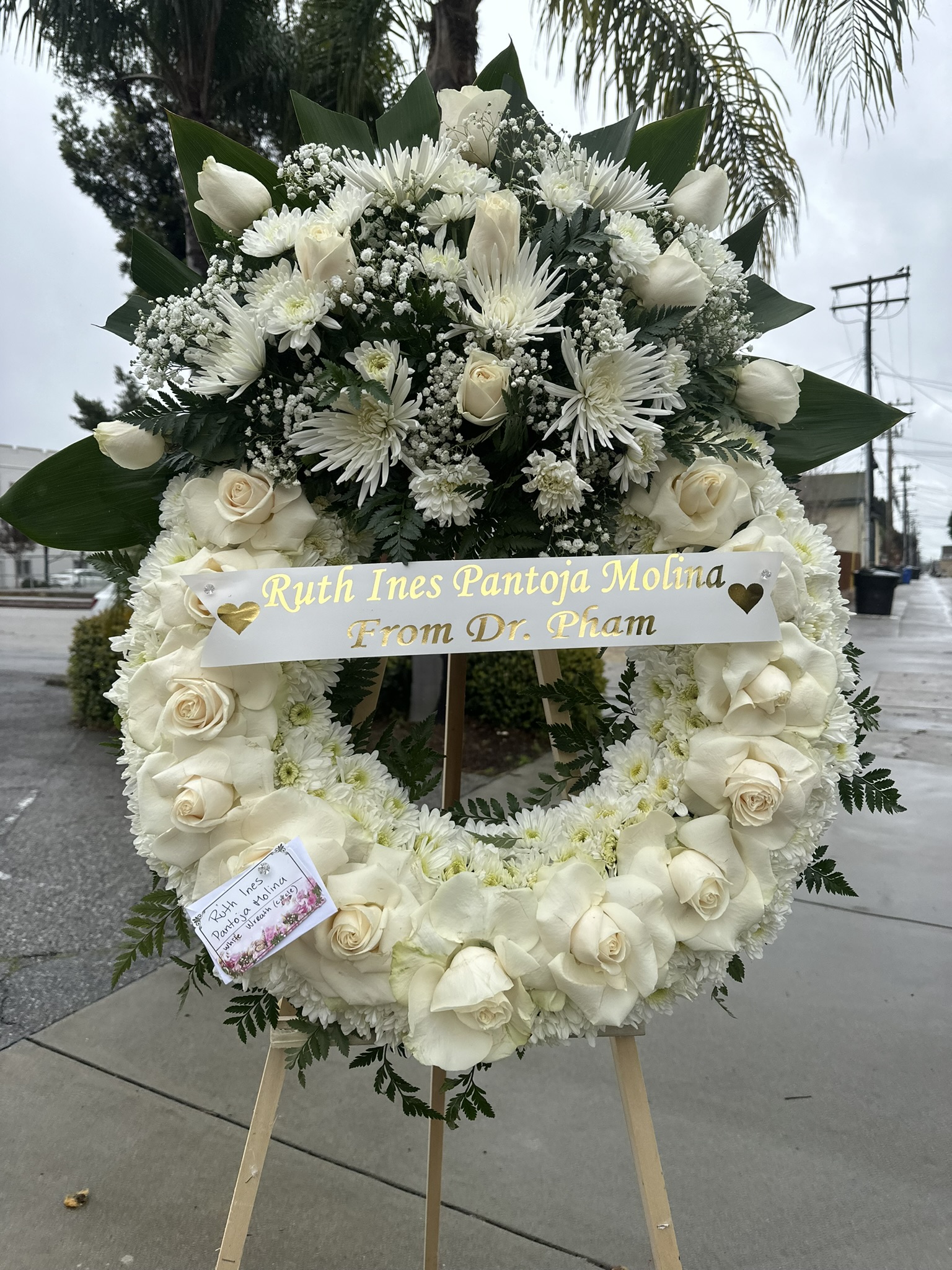 White theme Funeral Circle Wreath LARGE WHITE WREATH$380.00PriceExcluding Sales TaxMESSAGE FOR THE RIBBON*0/50Quantity*Add to CartDelivery ServicesFor delivery services please call us at the shop (562) 205-5356
